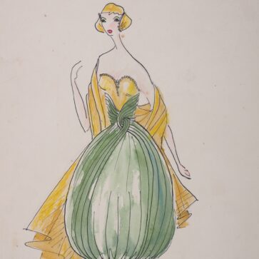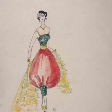 Zobacz więcejRysunek – projekt sukni, akwarela Magda Hauschulz 1958 r.