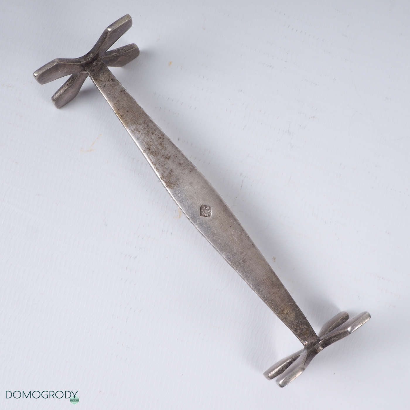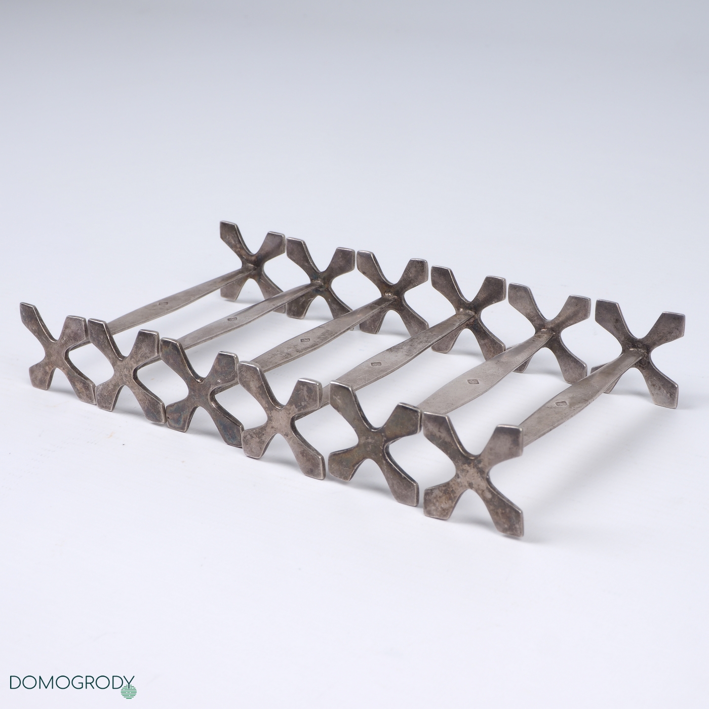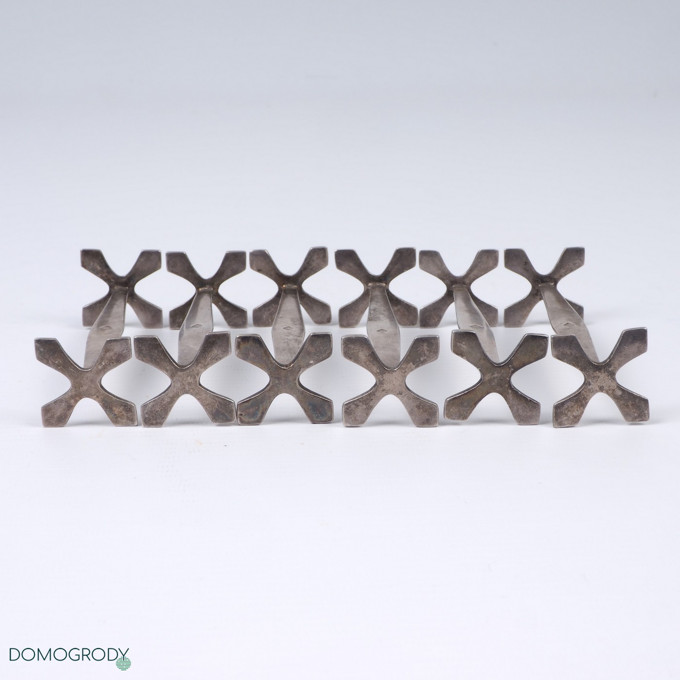 Zestaw sześciu koziołków pod sztućce o art dekowej geometrycznej formie. Wykonana ze srebrzonej alpaki przez Firmę „SZANDRIK” Austro-Węgry. Opatrzone sygnaturą stosowaną  przed 1918 rokiem. Stan bardzo dobry vintage.