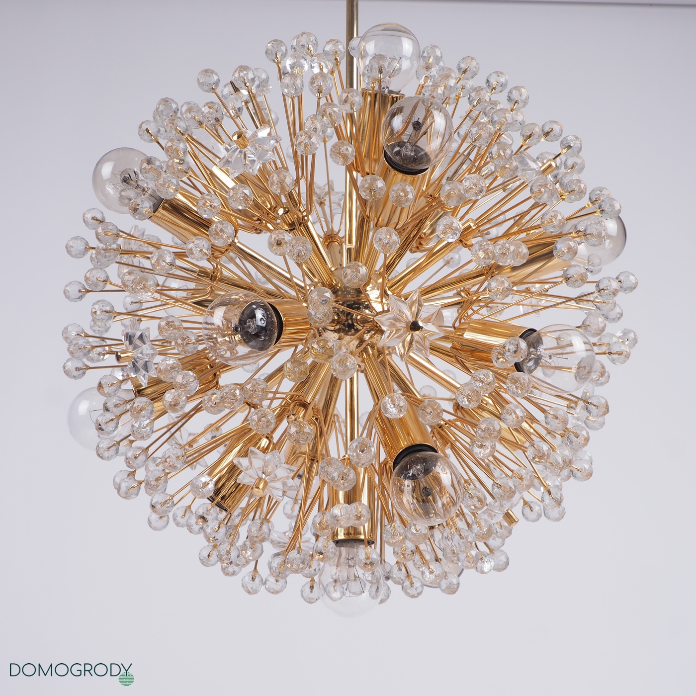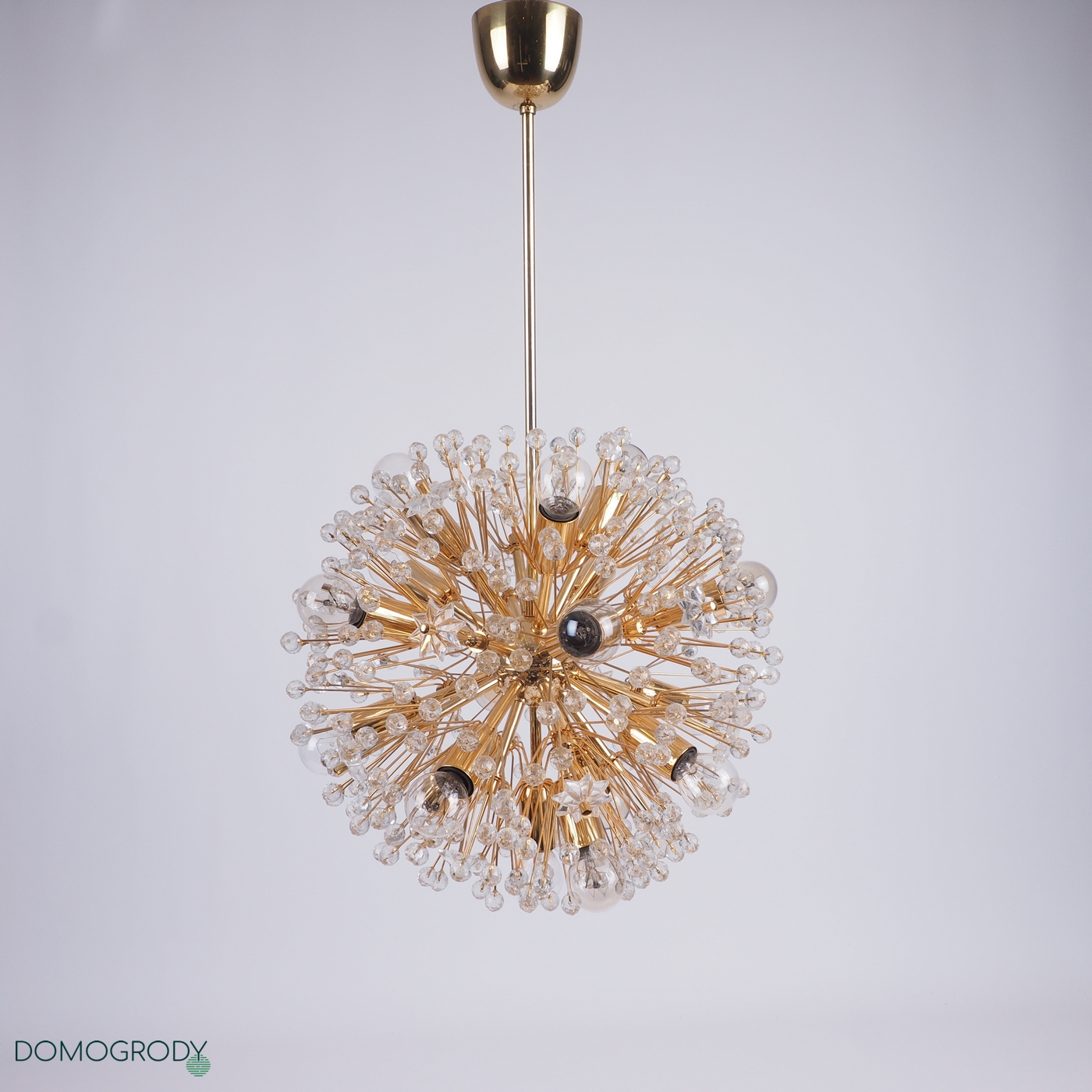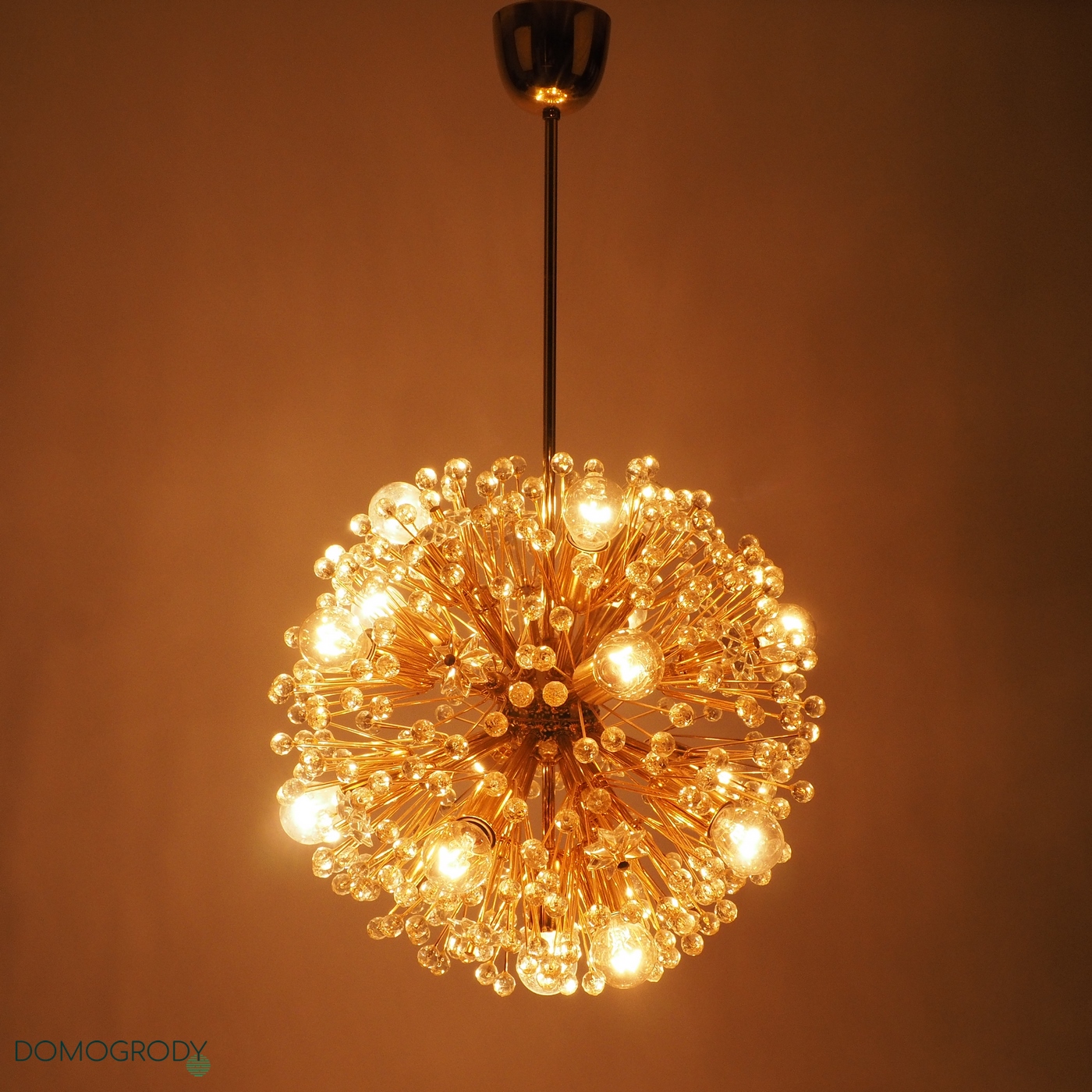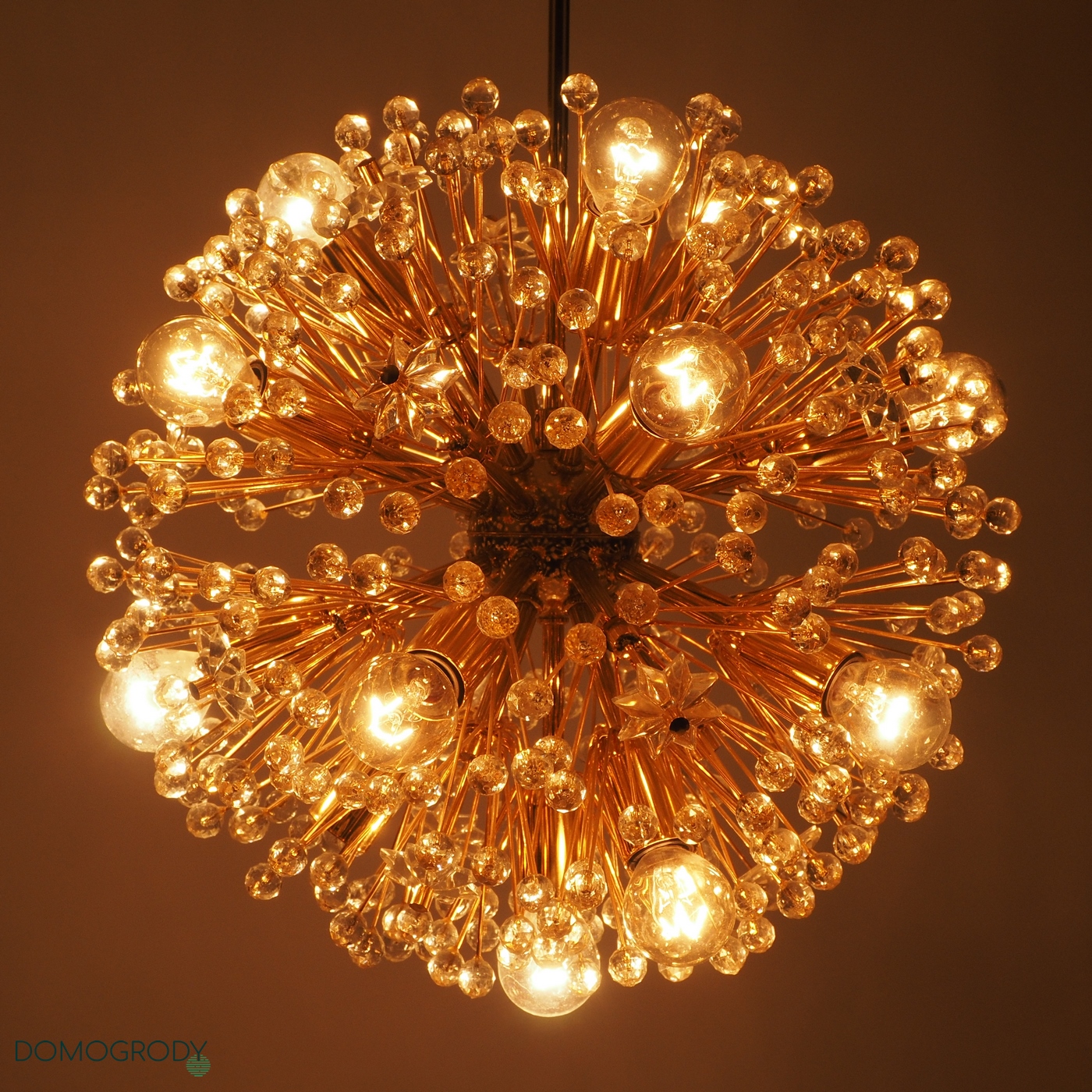 Lampa sufitowa z lat 60-tych. Projekt Emil Stejnar dla austriackiej Firmy Rupert Nikoll. Niektóre źródła podają jednak, że faktycznie lampę tę zaprojektował Nikola Ruperrt. Emil Stejnar (ur.1931 r.) jest najsłynniejszym projektantem który pracował dla Ruperta Nikola, pochodzi z Austrii, według Wikipedii zaprojektował wiele żyrandoli, kinkietów opraw sufitowych i luster. Lampa potocznie nazywana dmuchawcem lub kulą śnieżną, wykonana z mosiądzu i szkła kryształowego. Wymaga 17 żarówek z gwintem e14, jest zachowana w pięknym oryginalnym stanie, sprawna.