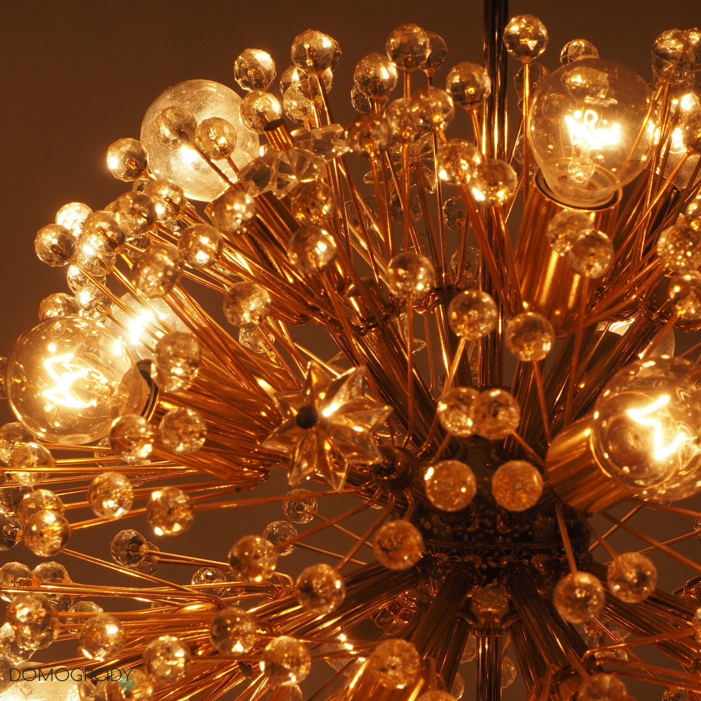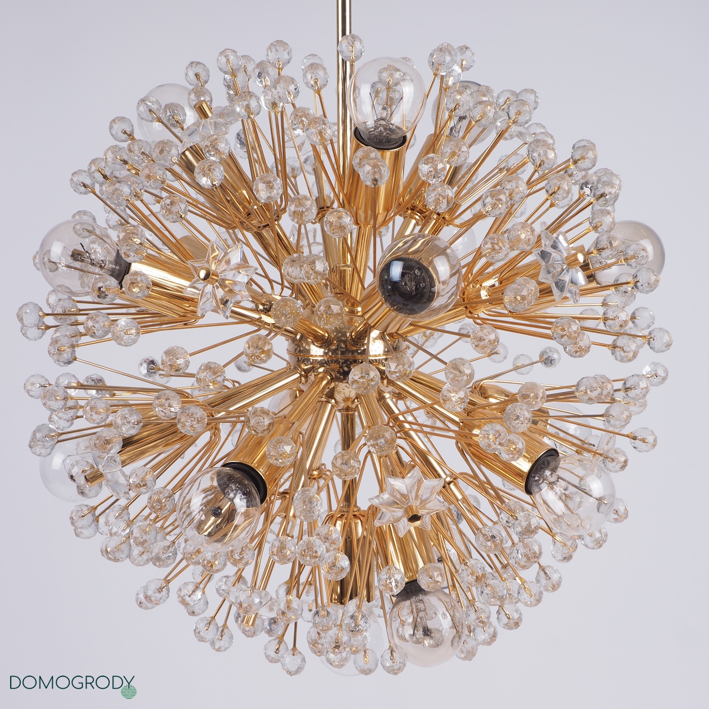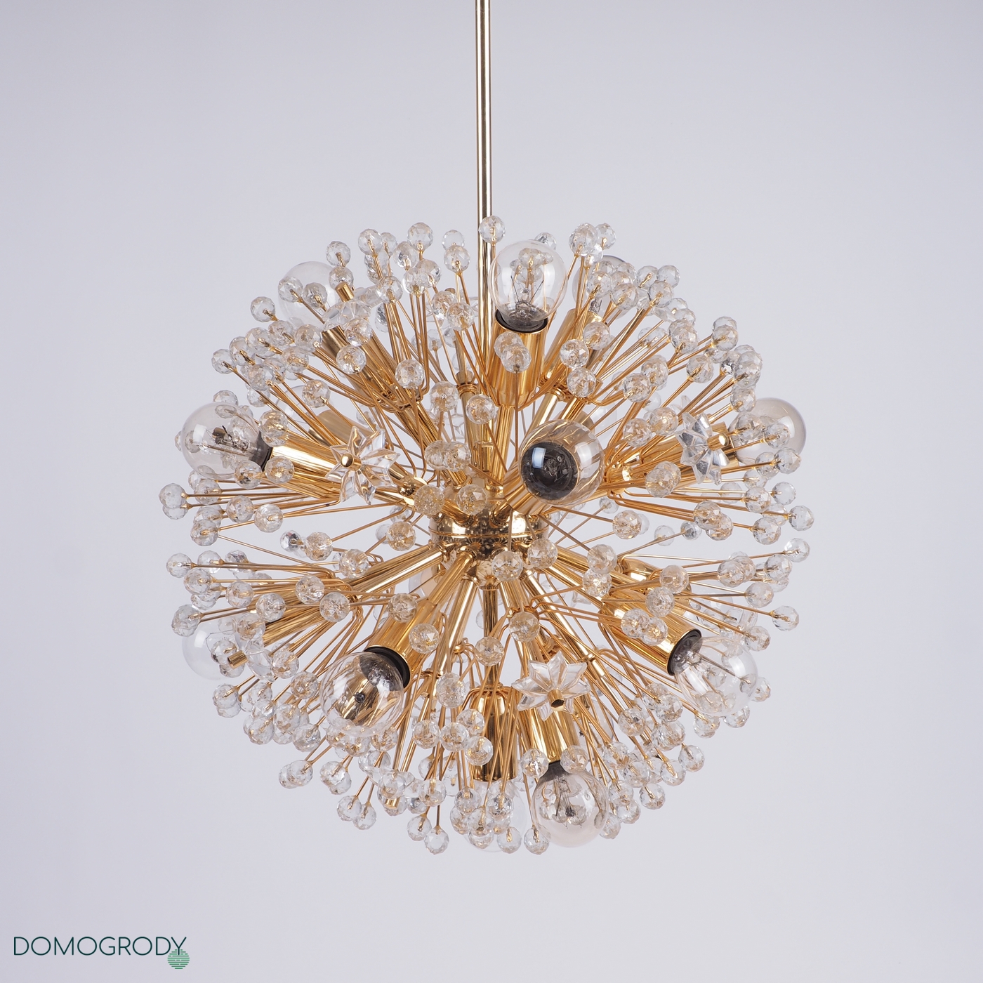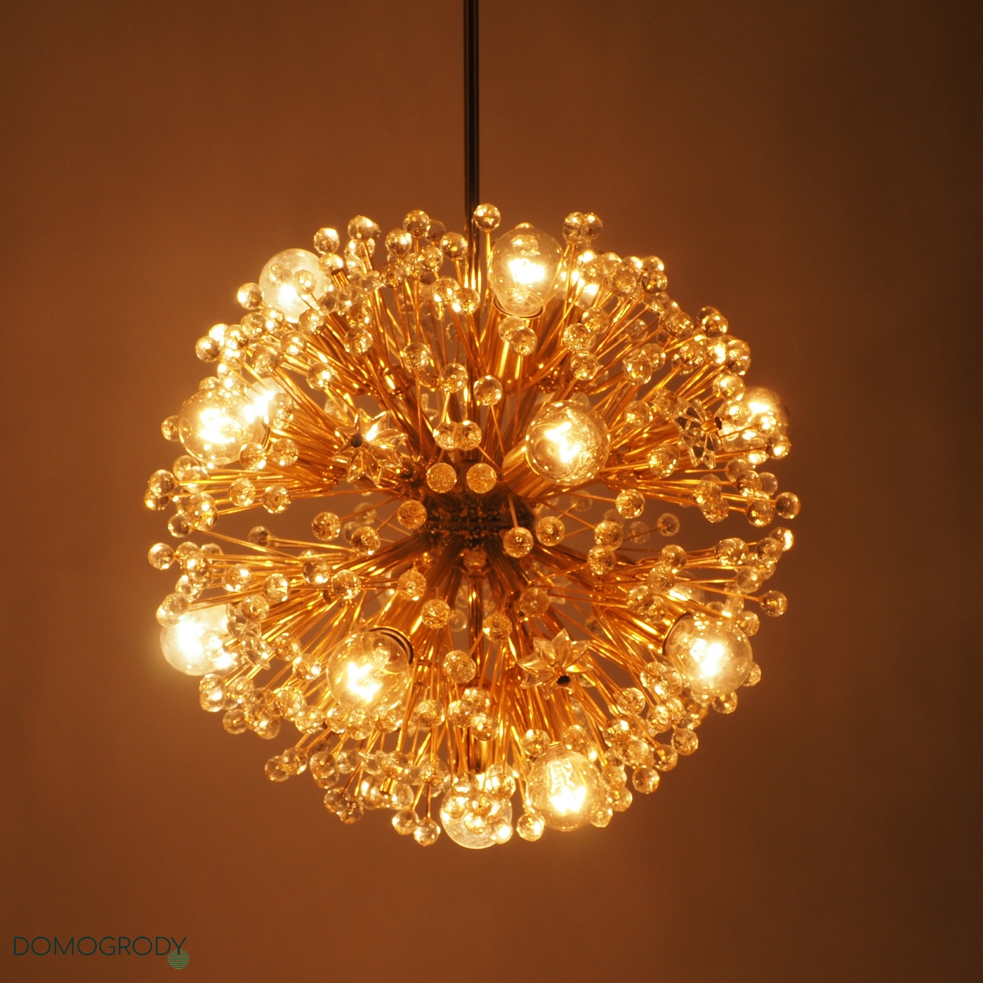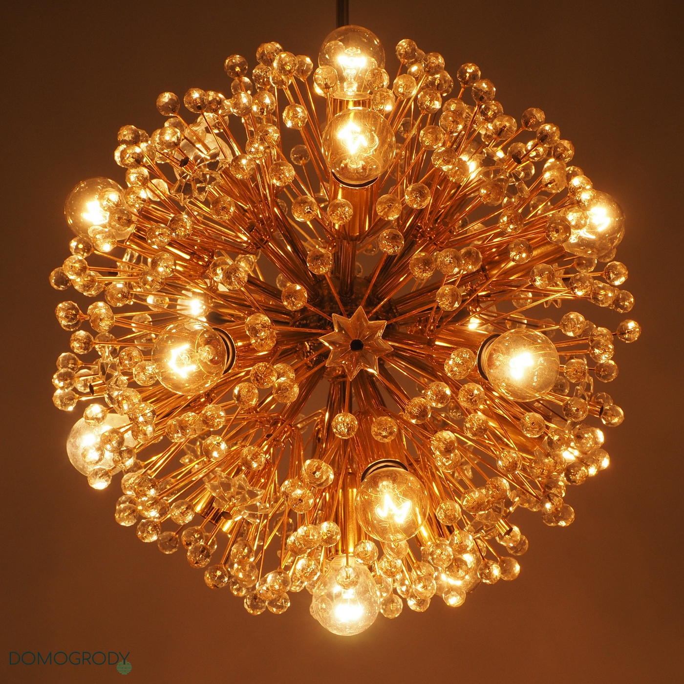 Lampa sufitowa z lat 60-tych. Projekt Emil Stejnar dla austriackiej Firmy Rupert Nikoll. Niektóre źródła podają jednak, że faktycznie lampę tę zaprojektował Nikola Ruperrt. Emil Stejnar (ur.1931 r.) jest najsłynniejszym projektantem który pracował dla Ruperta Nikola, pochodzi z Austrii, według Wikipedii zaprojektował wiele żyrandoli, kinkietów opraw sufitowych i luster. Lampa potocznie nazywana dmuchawcem lub kulą śnieżną, wykonana z mosiądzu i szkła kryształowego. Wymaga 17 żarówek z gwintem e14, jest zachowana w pięknym oryginalnym stanie, sprawna.