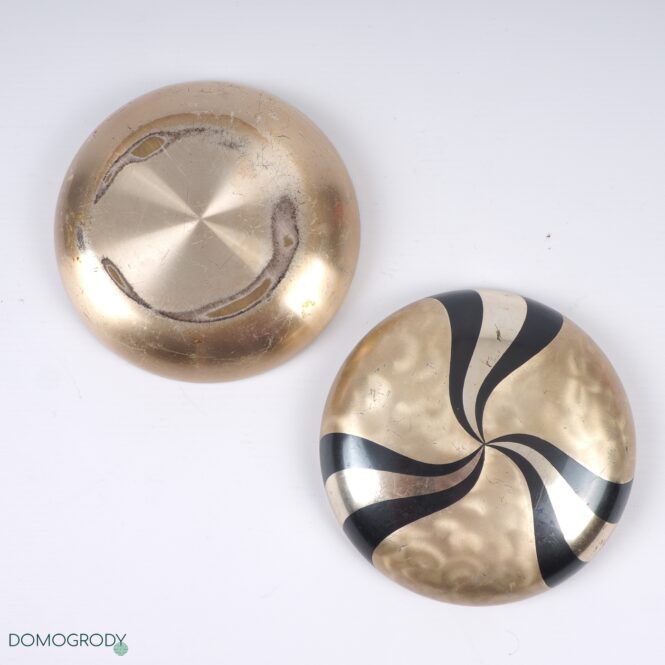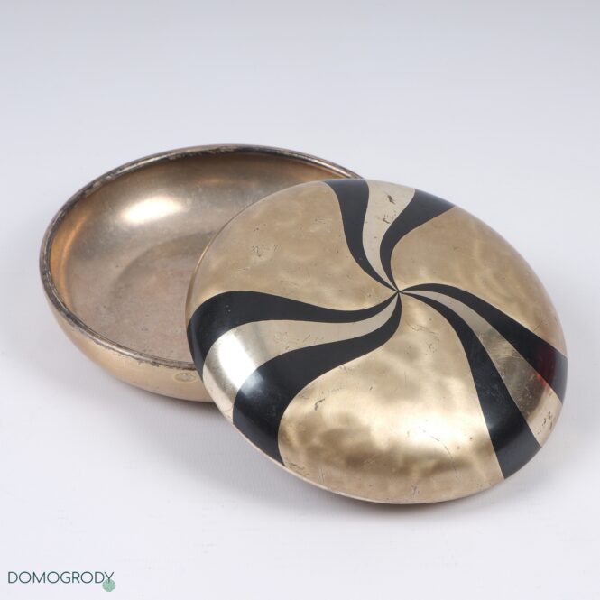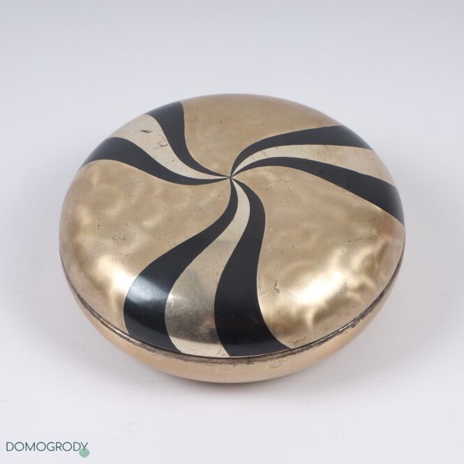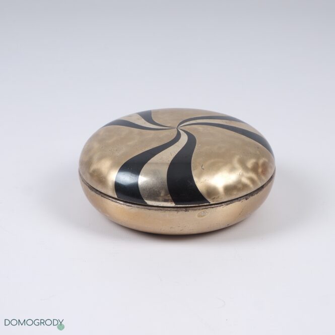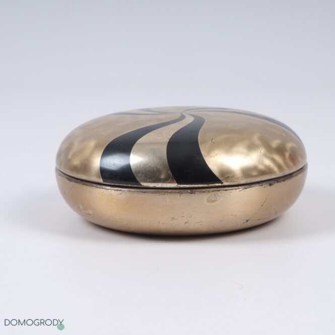 Pojemnik – bomboniera wykonany przez niemiecka wytwórnie WMF (Württembergische Metallwarenfabrik) w latach 20/30-tych. Przedmiot użytkowo – dekoracyjny o pięknej formie. Wykonany z platerowanego mosiądzu. Stan bardzo dobry vintage – dokładnie jak na zdjęciach. Sygnowany na podstawie.