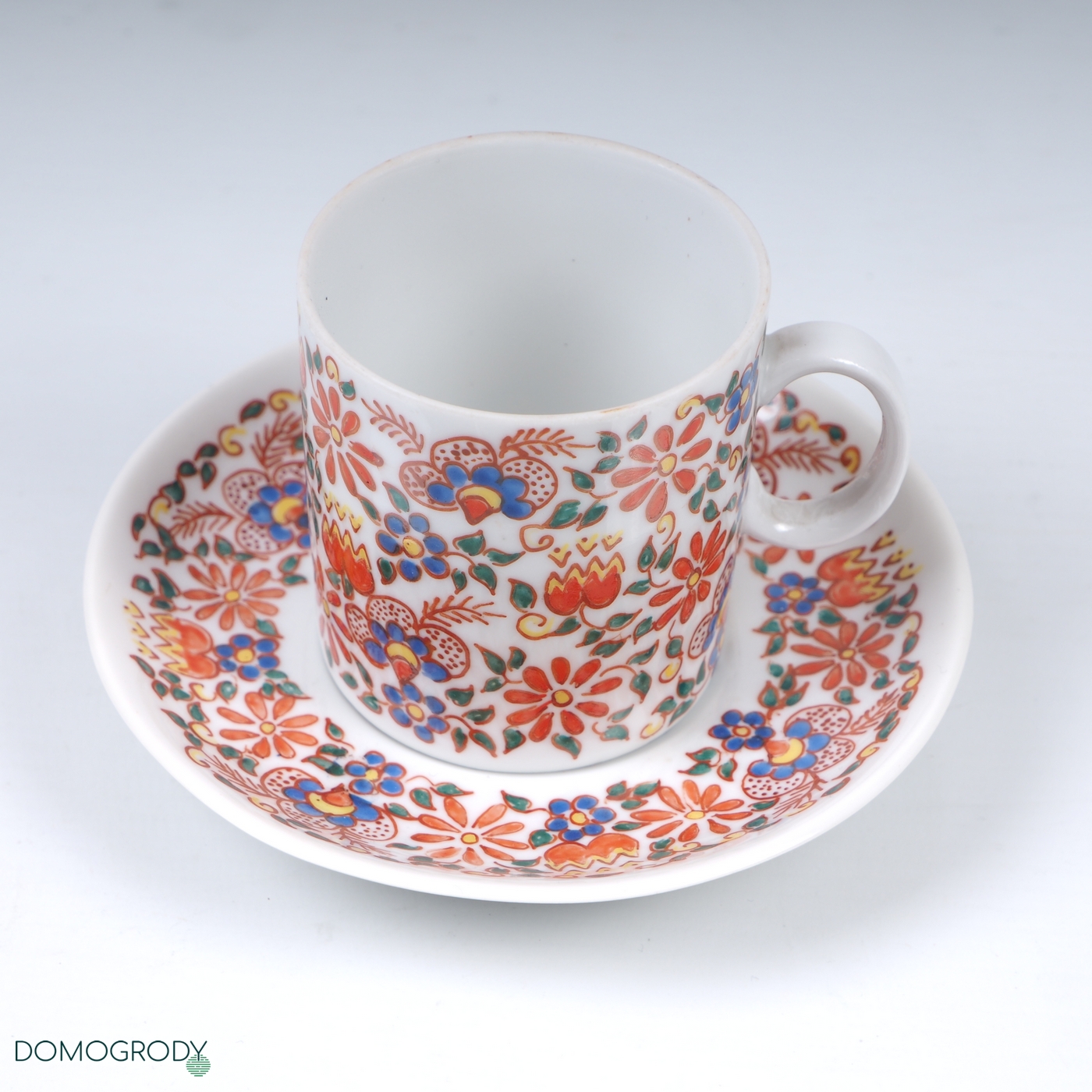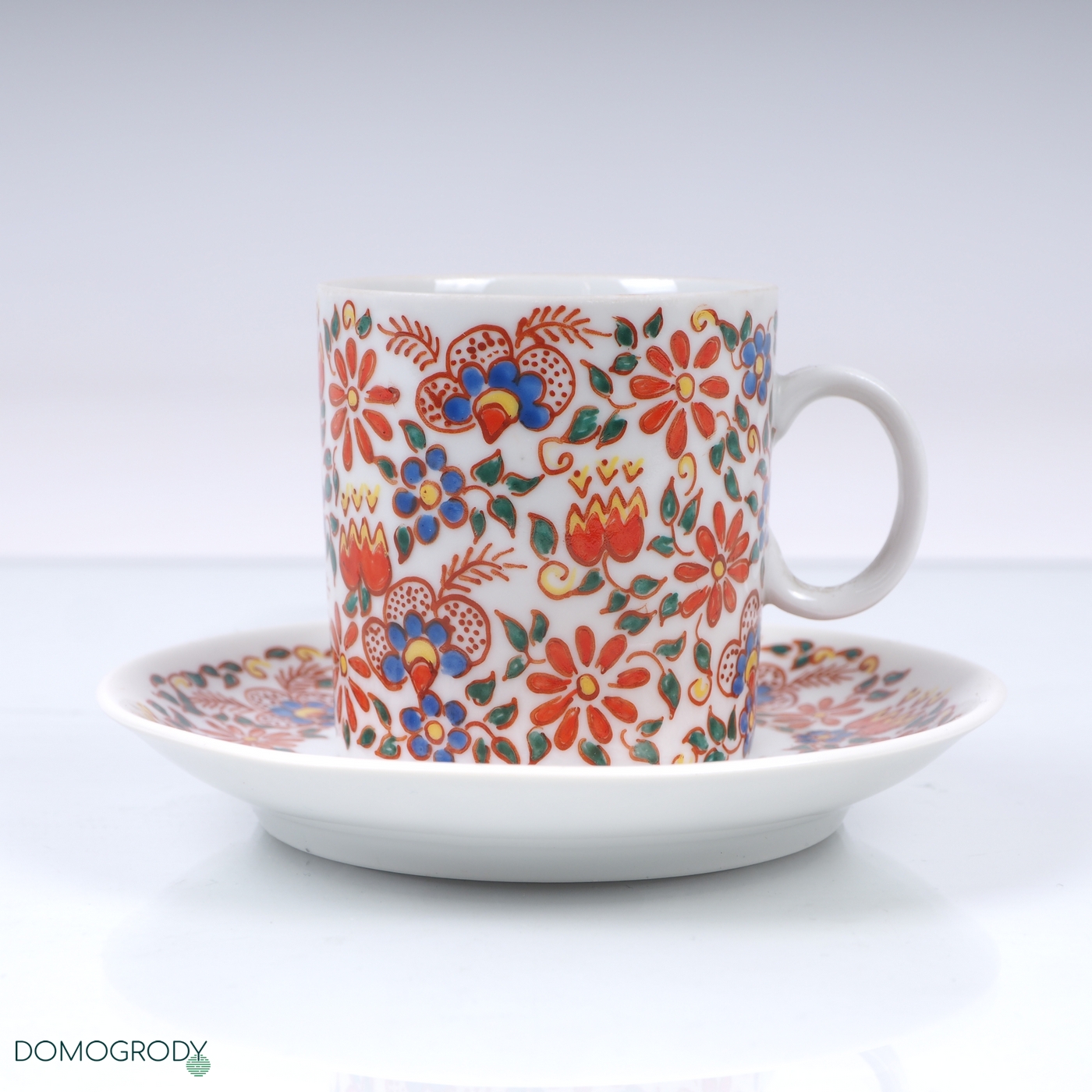 Porcelanowa filiżanka z talerzykiem. Cepelia opole ręcznie malowana. Filiżanka z talerzykiem opisane na podstawie „zdobiła ręcznie twórczyni ludowa Wyciszczok Anna , Staniszcze Wielkie pow. Strzelce Op. 1973”. Stan bardzo dobry z minimalnymi śladami użytkowania.